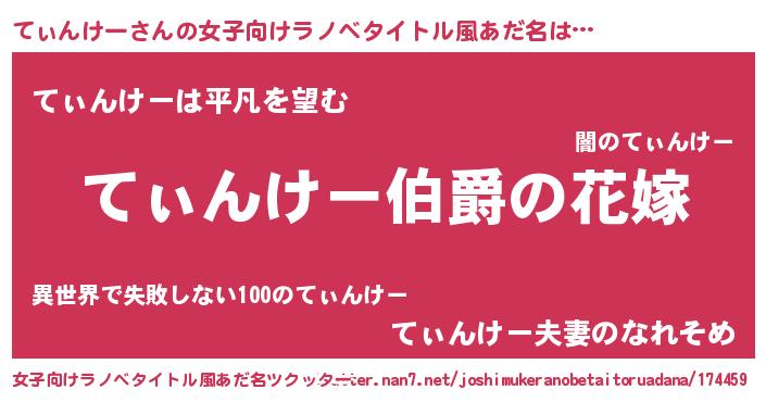 | 男性向けラノベタイトル風あだ名 | 『うちの娘の為ならば、俺はもしかしたらてぃんけーも倒せるかもしれない。』 |