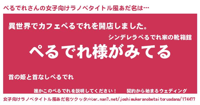 ぺるでれさんの女子向けラノベタイトル風あだ名は… 『ぺるでれ様がみてる』『異世界でカフェぺるでれを開店しました。』『誰かこのぺるでれを説明してください! ~契約から始まるウェディング~』 ツクッター #女子向けラノベタイトル風あだ名ツクッター http://tkutter.nan7.net/joshimukeranobetaitoruadana/174477/
