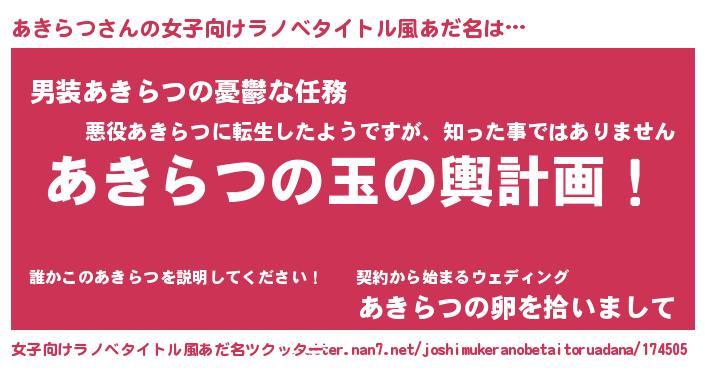 | 男性向けラノベタイトル風あだ名 | 『転生したらあきらつだった件』 |
