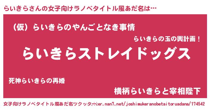 | 男性向けラノベタイトル風あだ名 | 『Re:らいきらから始める異世界生活』 |