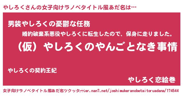 | 男性向けラノベタイトル風あだ名 | 『やしろくの憂鬱』『ヤシロクスレイヤー』 |