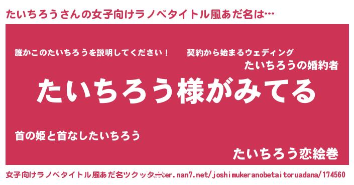 | 男性向けラノベタイトル風あだ名 | 『たいちろうの嫁は女の子じゃないと思った?』 |
