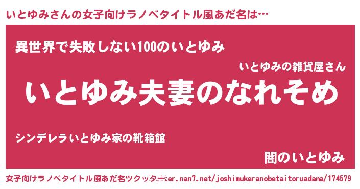 | 男性向けラノベタイトル風あだ名 | 『おまえをオタクにしてやるから、俺をいとゆみにしてくれ! 』 |