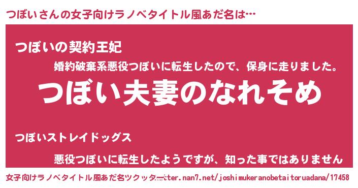 | 男性向けラノベタイトル風あだ名 | 『おまえをオタクにしてやるから、俺をつぼいにしてくれ! 』 |