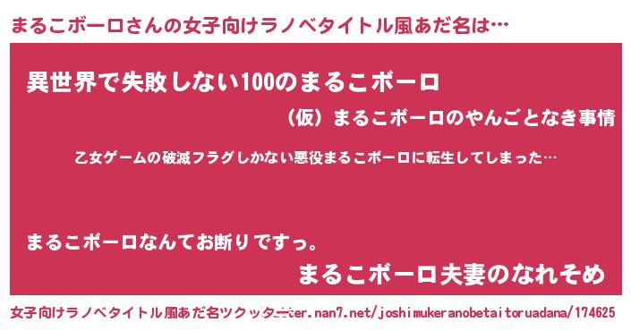 | 男性向けラノベタイトル風あだ名 | 『この素晴らしい世界にまるこボーロを!』 |