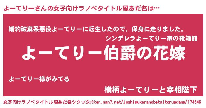 | 男性向けラノベタイトル風あだ名 | 『うちの娘の為ならば、俺はもしかしたらよーてりーも倒せるかもしれない。』 |