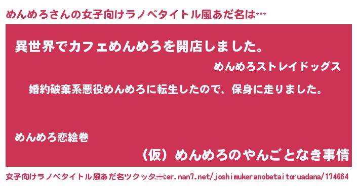 | 男性向けラノベタイトル風あだ名 | 『メンメロスレイヤー』『めんめろの憂鬱』 |