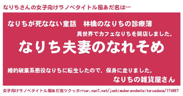 | 男性向けラノベタイトル風あだ名 | 『おまえをオタクにしてやるから、俺をなりちにしてくれ! 』 |
