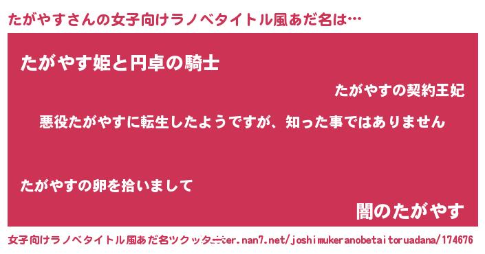 | 男性向けラノベタイトル風あだ名 | 『この素晴らしい世界にたがやすを!』 |