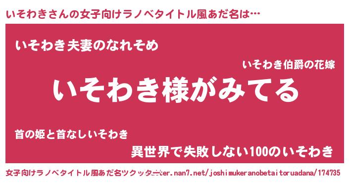 | 男性向けラノベタイトル風あだ名 | 『いそわきの嫁は女の子じゃないと思った?』 |