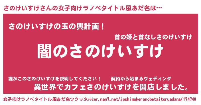 | 男性向けラノベタイトル風あだ名 | 『Re:さのけいすけから始める異世界生活』 |