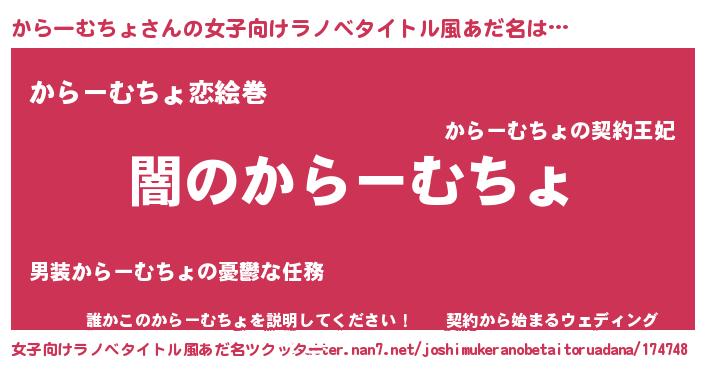 | 男性向けラノベタイトル風あだ名 | 『Re:からーむちょから始める異世界生活』 |