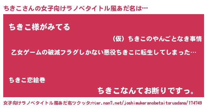 | 男性向けラノベタイトル風あだ名 | 『魔弾の王とちきこ』『ちきこの憂鬱』 |