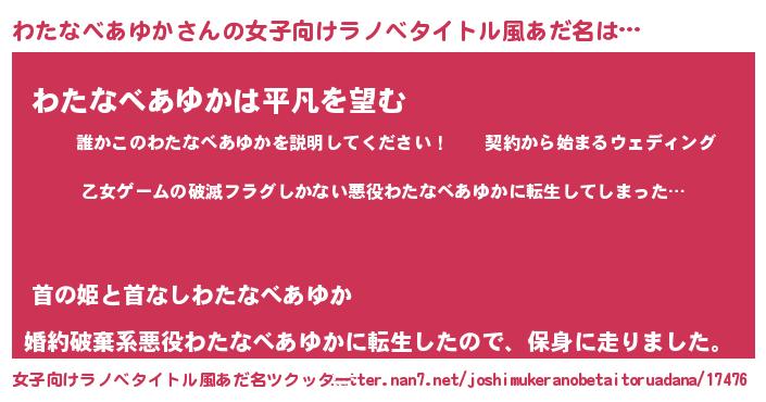 | ポケモン風あだ名 | 『ワータイ』『ヒワタナベアユカ』 |