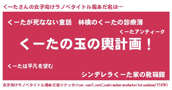 | 男性向けラノベタイトル風あだ名 | 『くーた~年齢イコール彼女いない歴の魔法使い~』 |