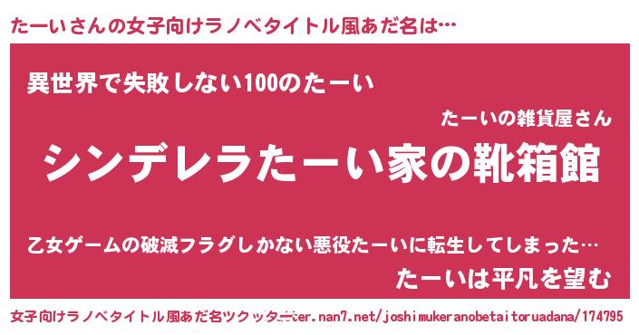| 男性向けラノベタイトル風あだ名 | 『冴えないたーいの育てかた』 |