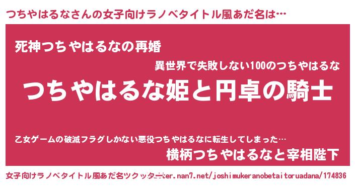 | 男性向けラノベタイトル風あだ名 | 『ツチヤハルナアートオンライン』 |