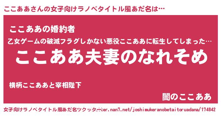 | 男性向けラノベタイトル風あだ名 | 『おまえをオタクにしてやるから、俺をここああにしてくれ! 』 |