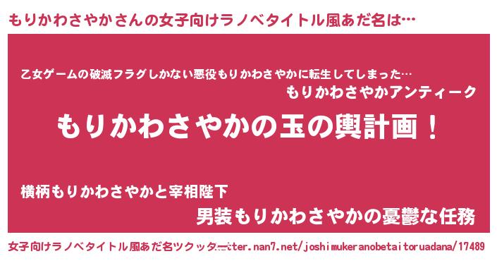 | 男性向けラノベタイトル風あだ名 | 『もりかわさやか~年齢イコール彼女いない歴の魔法使い~』 |
