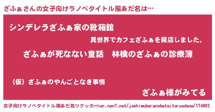 | 男性向けラノベタイトル風あだ名 | 『魔弾の王とざふぁ』『ざふぁの憂鬱』 |