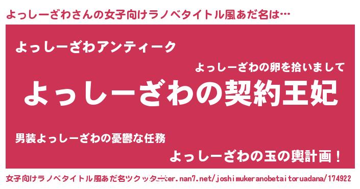 よっしーざわさんの女子向けラノベタイトル風あだ名は… 『よっしーざわの契約王妃』『よっしーざわアンティーク』『よっしーざわの玉の輿計画!』 ツクッター #女子向けラノベタイトル風あだ名ツクッター http://tkutter.nan7.net/joshimukeranobetaitoruadana/174922/