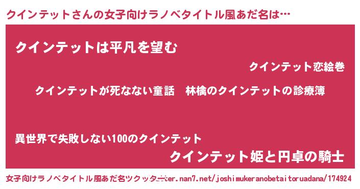 | 男性向けラノベタイトル風あだ名 | 『魔弾の王とクインテット』 |