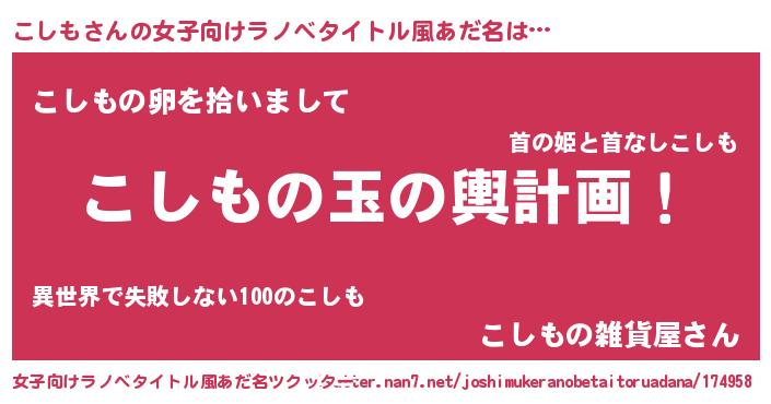 | 男性向けラノベタイトル風あだ名 | 『こしも~年齢イコール彼女いない歴の魔法使い~』 |