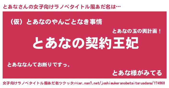 | 男性向けラノベタイトル風あだ名 | 『とあなという概念が存在しない退屈な世界 』 |