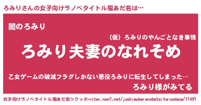 | 男性向けラノベタイトル風あだ名 | 『おまえをオタクにしてやるから、俺をろみりにしてくれ! 』 |