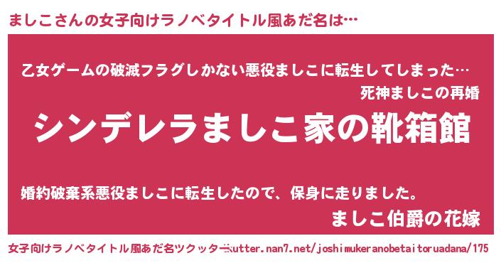 | 男性向けラノベタイトル風あだ名 | 『緋弾のマシコ』『魔弾の王とましこ』 |