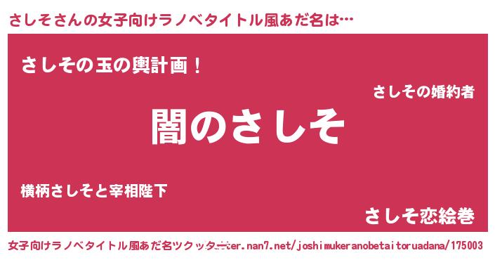 | 男性向けラノベタイトル風あだ名 | 『Re:さしそから始める異世界生活』 |