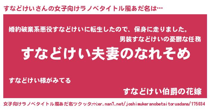 | 男性向けラノベタイトル風あだ名 | 『おまえをオタクにしてやるから、俺をすなどけいにしてくれ! 』 |