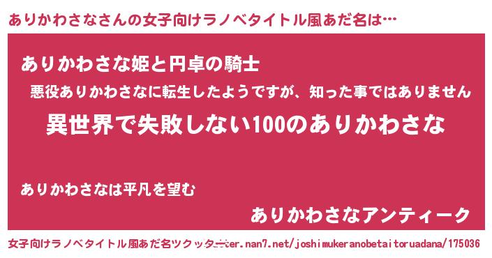 | 男性向けラノベタイトル風あだ名 | 『ありかわさなという概念が存在しない退屈な世界 』 |