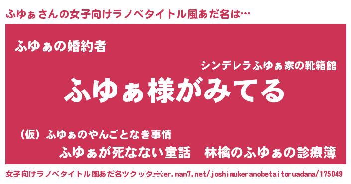 ふゆぁさんの女子向けラノベタイトル風あだ名は… 『ふゆぁ様がみてる』『ふゆぁの婚約者』『ふゆぁが死なない童話 林檎のふゆぁの診療簿』 ツクッター #女子向けラノベタイトル風あだ名ツクッター http://tkutter.nan7.net/joshimukeranobetaitoruadana/175049/