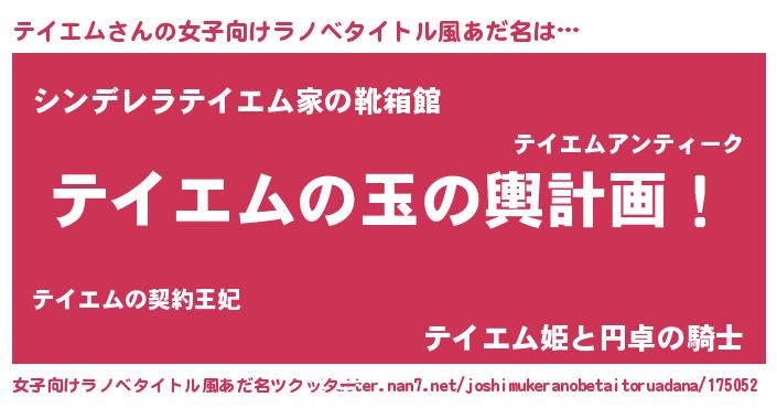 | 男性向けラノベタイトル風あだ名 | 『転生したらテイエムだった件』 |