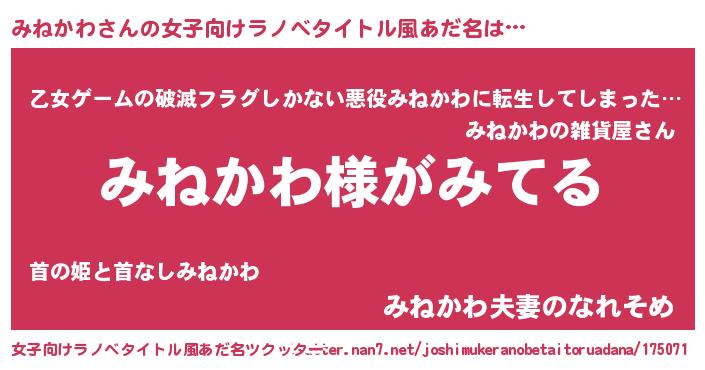 みねかわさんの女子向けラノベタイトル風あだ名は… 『みねかわ様がみてる』『乙女ゲームの破滅フラグしかない悪役みねかわに転生してしまった…』『みねかわ夫妻のなれそめ』 ツクッター #女子向けラノベタイトル風あだ名ツクッター http://tkutter.nan7.net/joshimukeranobetaitoruadana/175071/
