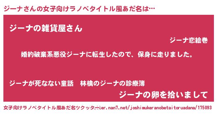 | 男性向けラノベタイトル風あだ名 | 『ジーナスレイヤー』『魔弾の王とジーナ』 |