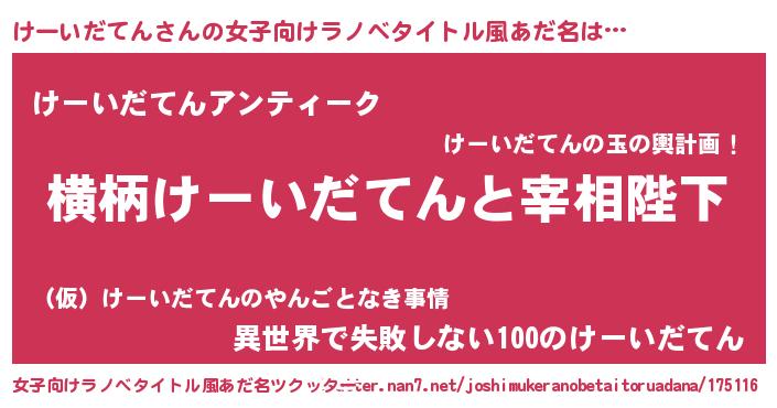 | 男性向けラノベタイトル風あだ名 | 『けーいだてんに滅ぼされるだけの簡単なお仕事です』 |