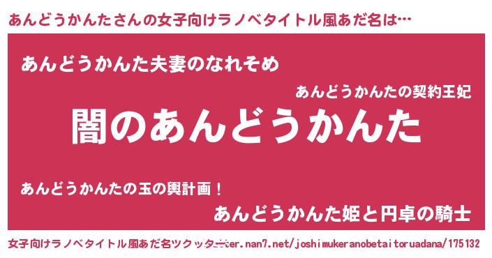 | 男性向けラノベタイトル風あだ名 | 『Re:あんどうかんたから始める異世界生活』 |