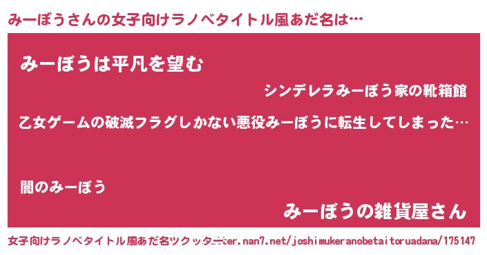 | 男性向けラノベタイトル風あだ名 | 『この素晴らしい世界にみーぼうを!』 |
