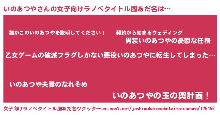 いのあつやさんの女子向けラノベタイトル風あだ名は… 『乙女ゲームの破滅フラグしかない悪役いのあつやに転生してしまった…』『誰かこのいのあつやを説明してください! ~契約から始まるウェディング~』『いのあつやの玉の輿計画!』 ツクッター #女子向けラノベタイトル風あだ名ツクッター http://tkutter.nan7.net/joshimukeranobetaitoruadana/175156/