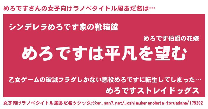 | 男性向けラノベタイトル風あだ名 | 『ダンジョンにめろですを求めるのは間違っているだろうか』 |