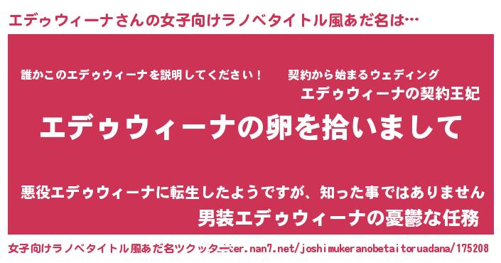 エデゥウィーナさんの女子向けラノベタイトル風あだ名は… 『エデゥウィーナの卵を拾いまして』『誰かこのエデゥウィーナを説明してください! ~契約から始まるウェディング~』『男装エデゥウィーナの憂鬱な任務』 ツクッター #女子向けラノベタイトル風あだ名ツクッター http://tkutter.nan7.net/joshimukeranobetaitoruadana/175208/
