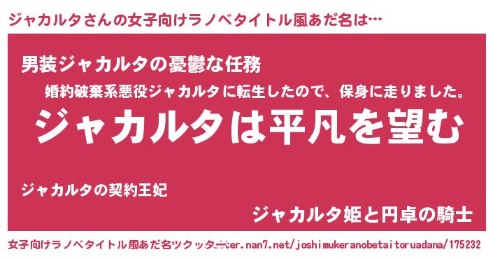| 男性向けラノベタイトル風あだ名 | 『ダンジョンにジャカルタを求めるのは間違っているだろうか』 |
