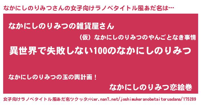 なかにしのりみつさんの女子向けラノベタイトル風あだ名は… 『異世界で失敗しない100のなかにしのりみつ』『なかにしのりみつの雑貨屋さん』『なかにしのりみつ恋絵巻』 ツクッター #女子向けラノベタイトル風あだ名ツクッター http://tkutter.nan7.net/joshimukeranobetaitoruadana/175289/