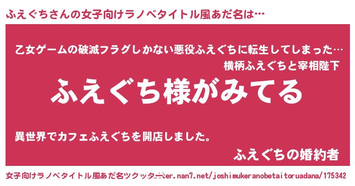 | 男性向けラノベタイトル風あだ名 | 『ふえぐちの嫁は女の子じゃないと思った?』 |