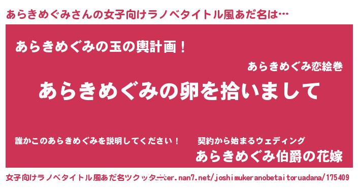 | 男性向けラノベタイトル風あだ名 | 『あらきめぐみの嫁は女の子じゃないと思った?』 |