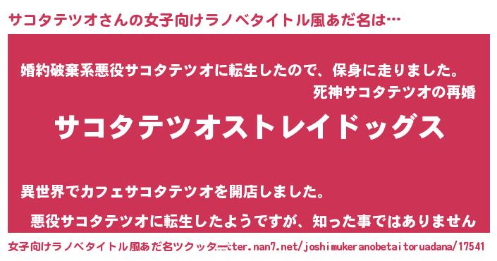 | 男性向けラノベタイトル風あだ名 | 『Re:サコタテツオから始める異世界生活』 |