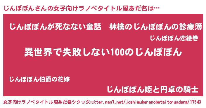 | 男性向けラノベタイトル風あだ名 | 『じんぼぼんという概念が存在しない退屈な世界 』 |