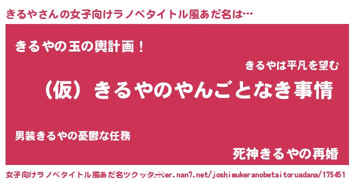 | 男性向けラノベタイトル風あだ名 | 『きるやの憂鬱』 |